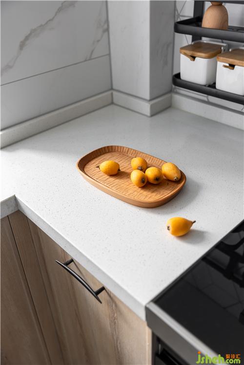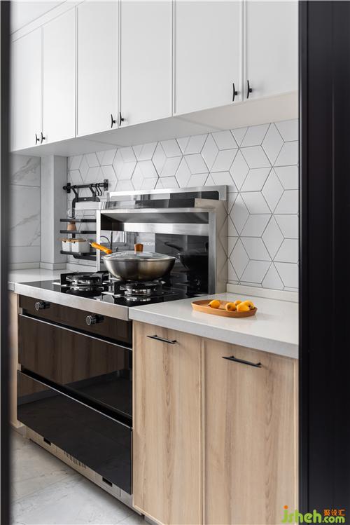 廚房整體設(shè)計(jì)以簡潔實(shí)用為主,白色吊柜與木色地柜的柜門形式統(tǒng)一,墻面白色六角幾何花磚,為空間增添幾分趣味.