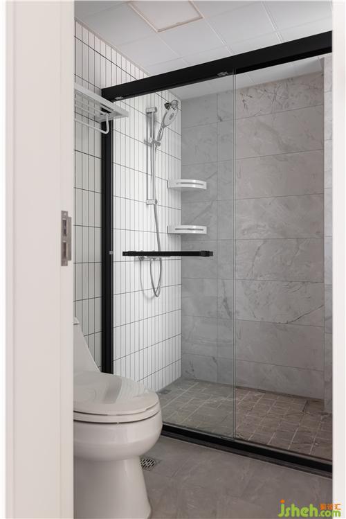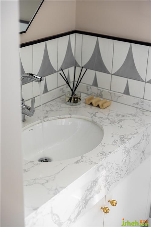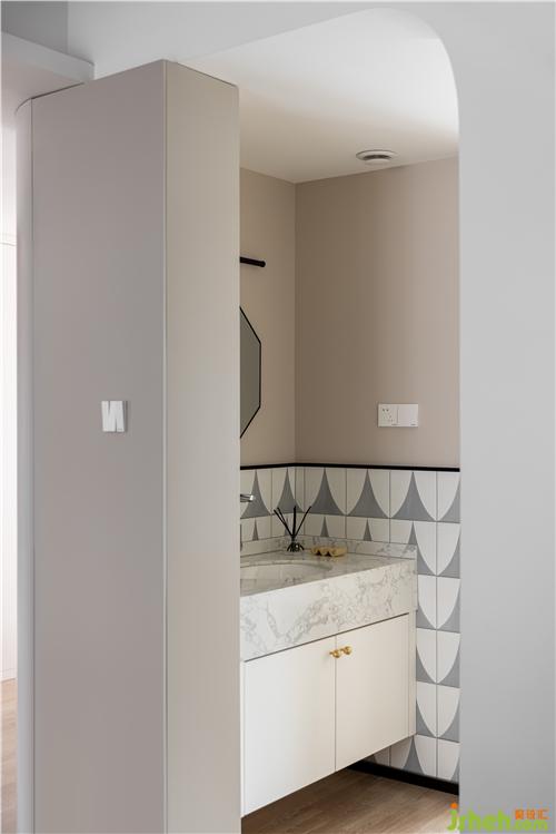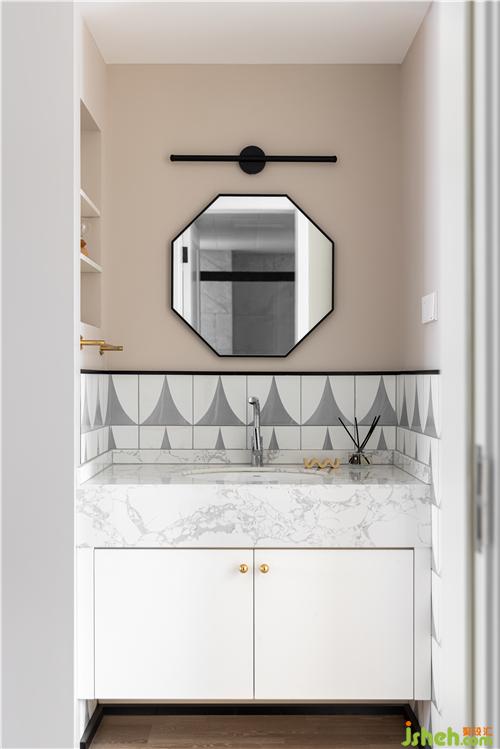 干區(qū)半墻幾何手工花磚秩序排布,八邊形黑框銀鏡、極簡壁燈、黑色金屬線條,理性直線與溫潤奶茶色碰撞,靜謐又柔和南京裝修設(shè)計(jì).