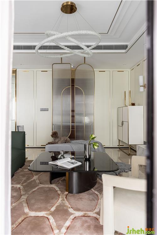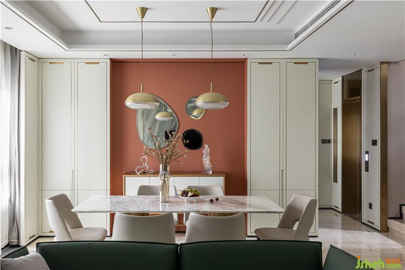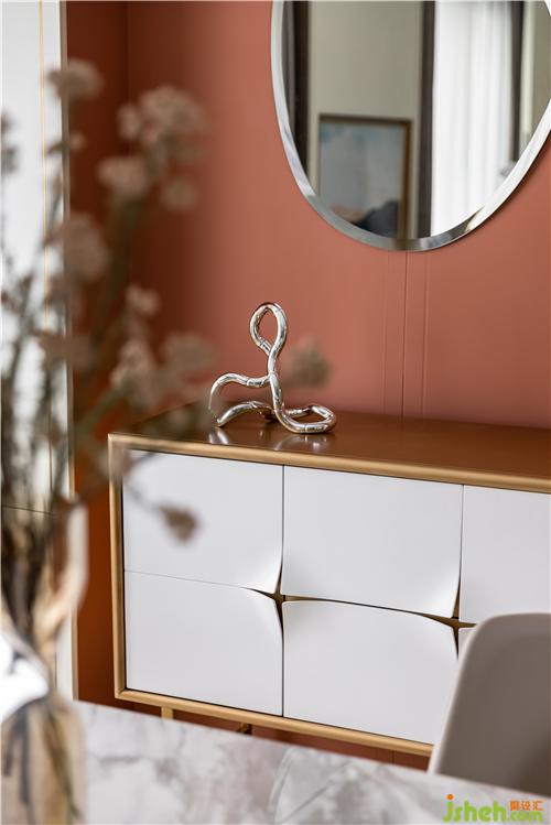 維持了原有的格局,餐邊柜區(qū)域用獨(dú)特的西柚色系作為點(diǎn)綴,鏡面裝飾無形中延伸視野,加上松茸造型的垂感吊燈,讓空間更具輕奢、精致的氛圍.