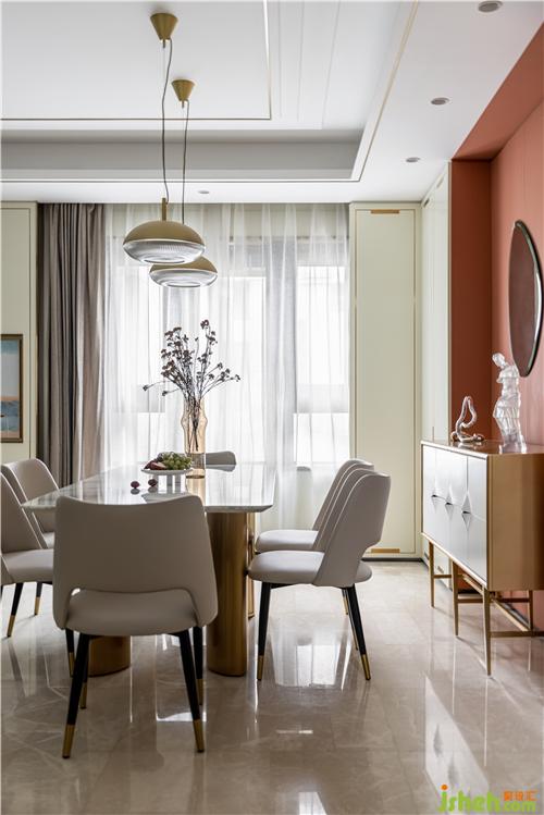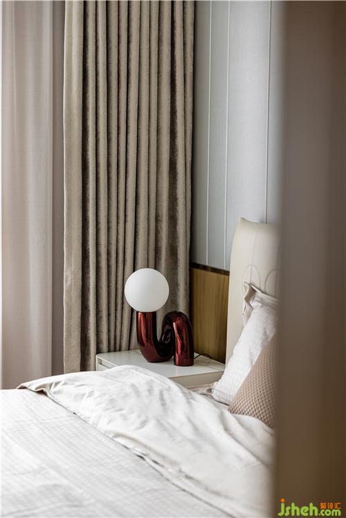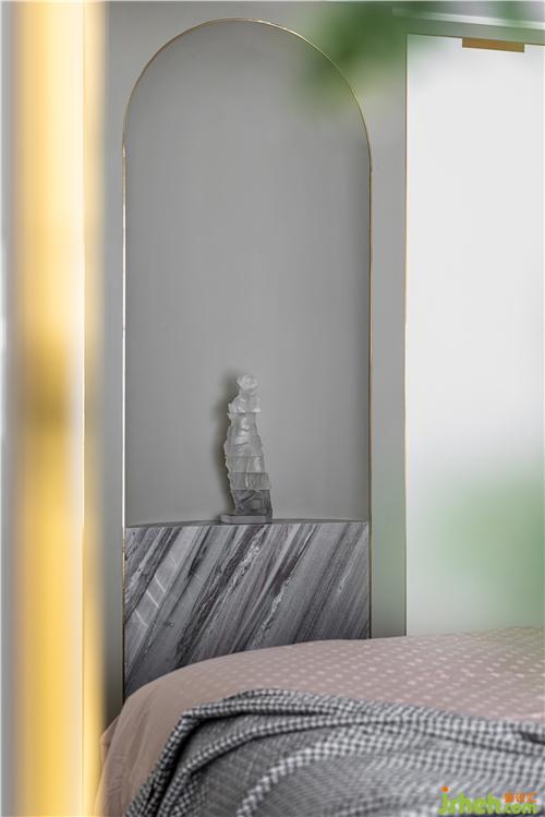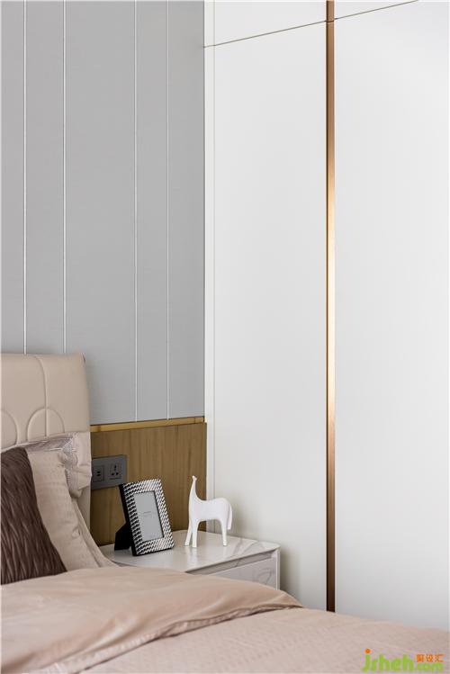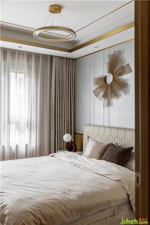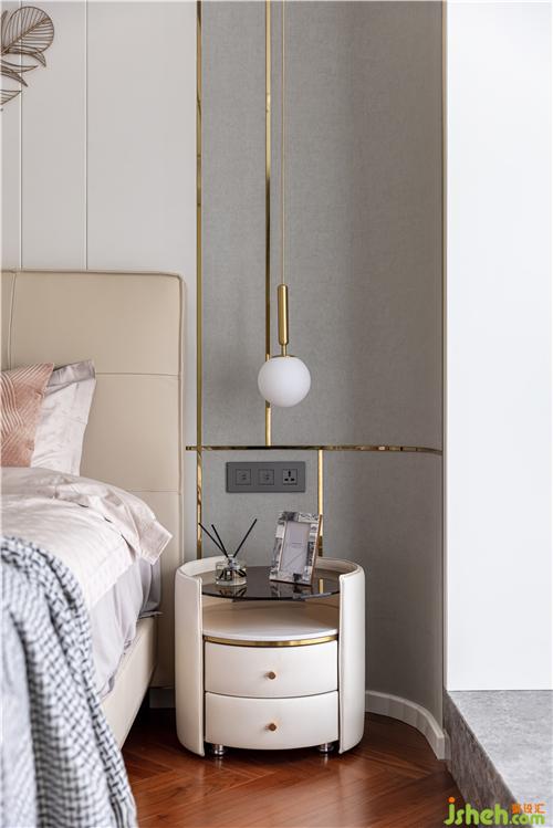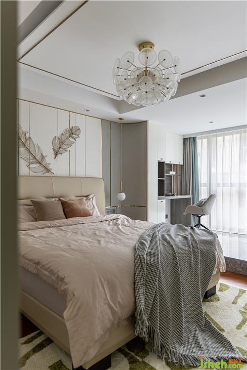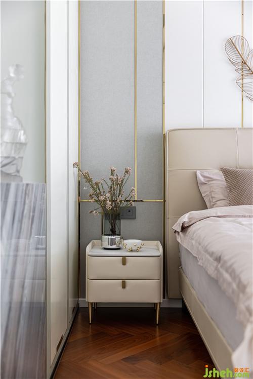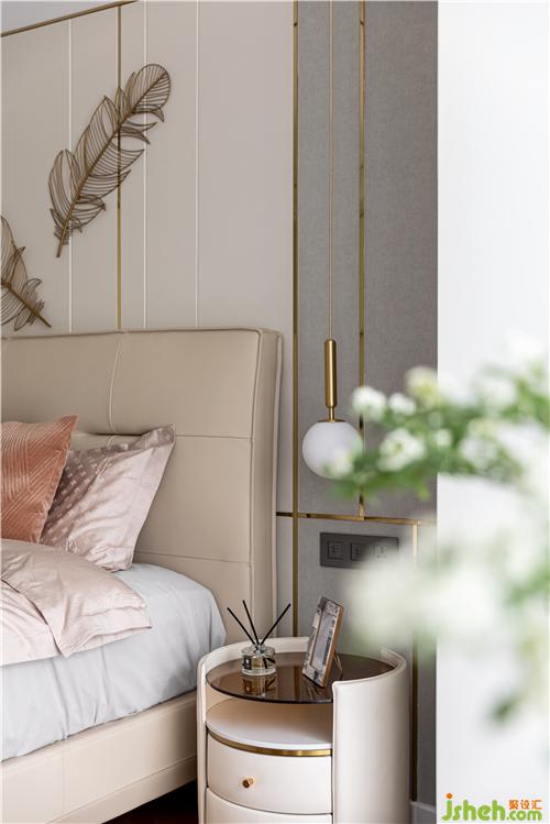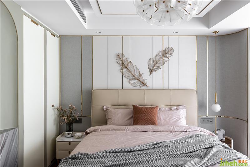 主臥的設(shè)計(jì)沿用了業(yè)主想要的生活質(zhì)感,背景重新設(shè)計(jì)了灰色硬包與金屬線條穿插與整體硬裝相呼應(yīng),金色羽毛墻飾、真皮材質(zhì)床背,搭配柔軟的床品,營(yíng)造出治愈的舒睡空間. 使空間在充分表現(xiàn)質(zhì)感的前提下也滿足臥室休憩的溫馨.