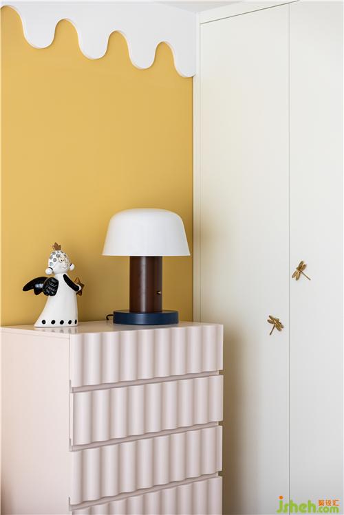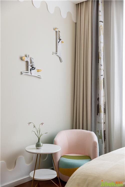 采光井被打通納入室內(nèi),利用地臺抬高兩步劃分區(qū)域,消防管道藏匿于柜體之中,這一方小天地打造成女兒的玩??臻g.