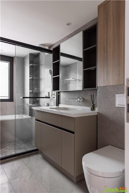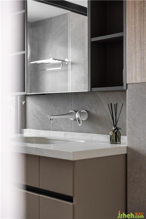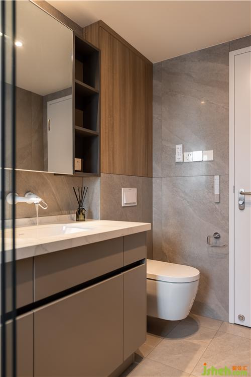 主衛(wèi)打破傳統(tǒng)布置方式,臺盆內(nèi)置,如廁區(qū)與淋浴區(qū)分開,避免細菌滋生. 鏡柜結合開放架形式,方便日常洗漱用品放置,同時利用壁掛馬桶的墻體構造,增加儲物空間.