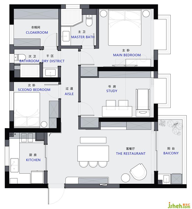 2. 設(shè)置獨(dú)立書(shū)房,門(mén)后墻體外擴(kuò),形成儲(chǔ)物柜,客廳一側(cè)形成餐邊柜與儲(chǔ)物柜,增加儲(chǔ)物空間