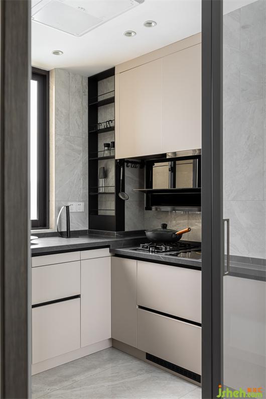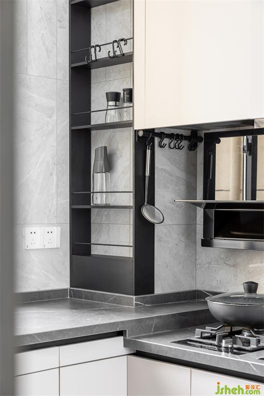 廚房設(shè)置高低臺(tái)面,符合人體工學(xué),炒菜洗菜更加輕松. 定制鋼板置物架,釋放臺(tái)面空間,干凈整潔.
