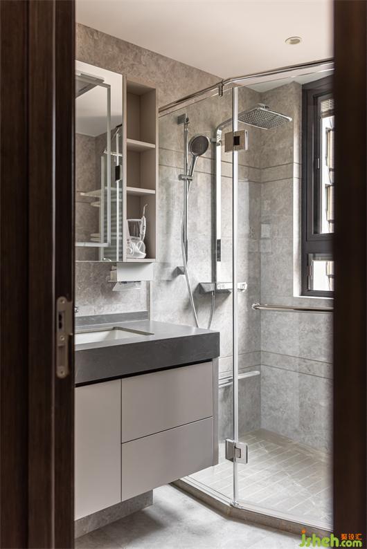 浴室柜沿用公共空間色系,重新設(shè)計,鏡柜保留開放格,南京家居設(shè)計增加儲物空間的同時提高空間利用率.