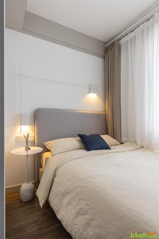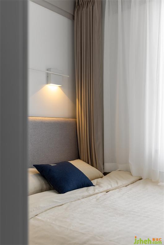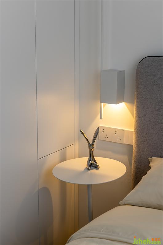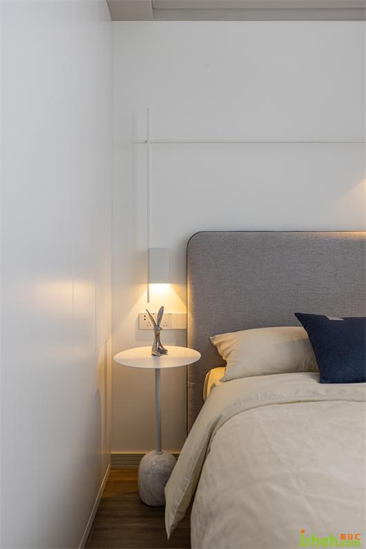 純白色與灰色,適度的點綴絲絨質(zhì)感,打造出簡約干凈、素雅的時尚空間. 線條感壁燈點綴墻面,為空間增添了溫馨感.