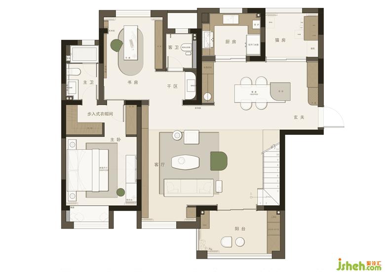 5. 主臥進入睡眠區(qū)設(shè)置步入式衣帽間,將衛(wèi)生間與睡眠區(qū)進行隔離,保證睡眠區(qū)的隱私性