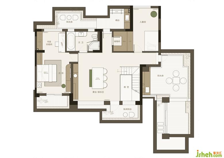 6. 二樓公共區(qū)域作為多功能過渡空間,可因功能需求不同進行切換