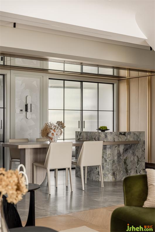花漾美作餐桌與島臺合并的形式讓整個餐廳串聯(lián)起來,高低錯落的設(shè)計豐富了家具的趣味性。