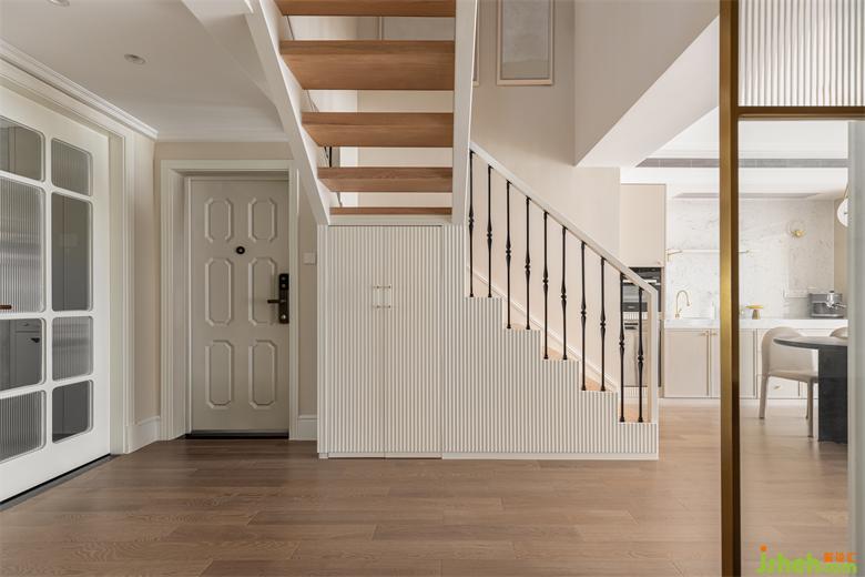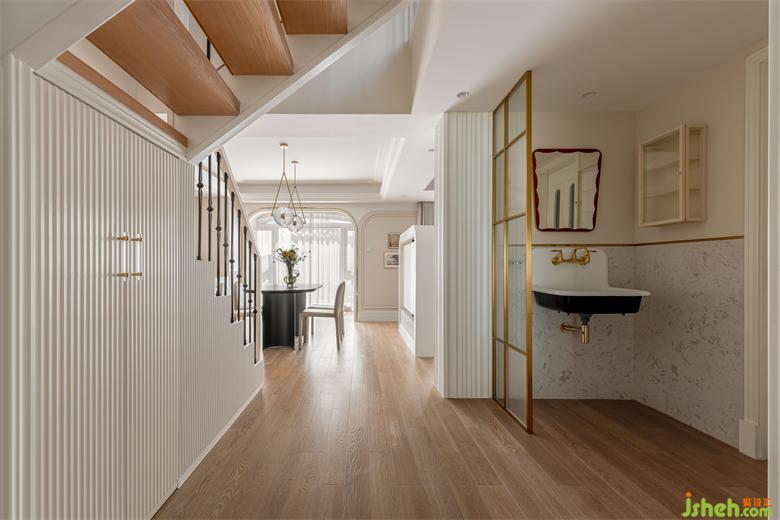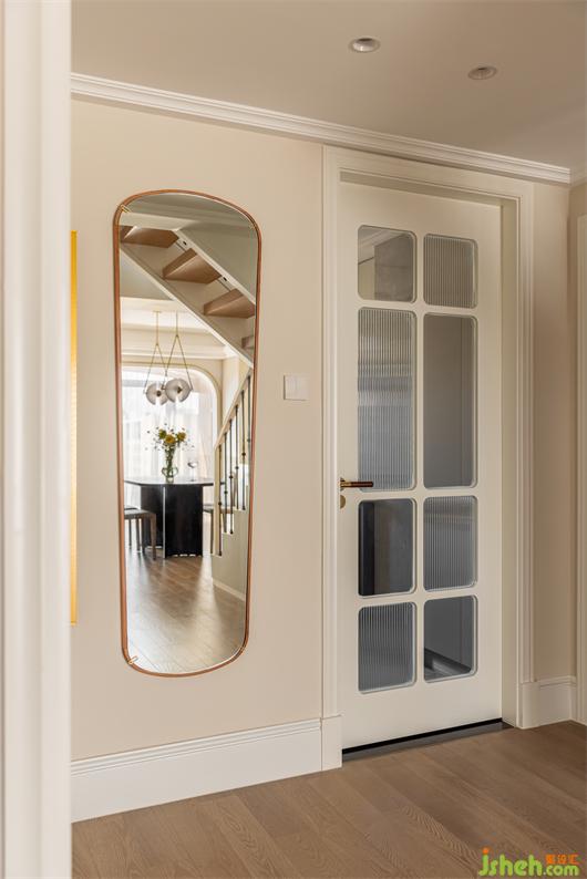 入戶空間沒有玄關(guān)過渡,有種局促感,為了弱化這種感覺,我們將客臥墻體和干區(qū)整體后退,擴(kuò)大門廳和過廳區(qū)域,鞋柜與樓梯下方收納做結(jié)合,樓梯上樓方向設(shè)置在餐廳這側(cè),讓門廳與過廳整體充分寬敞,客臥門自然就成了“玄關(guān)背景”,花漾美作設(shè)計(jì)了一款特別款式的房門,作為玄關(guān)背景.入戶右手邊設(shè)置了櫻桃木的全身鏡和銅質(zhì)壁燈,為入戶增添了復(fù)古氛圍。