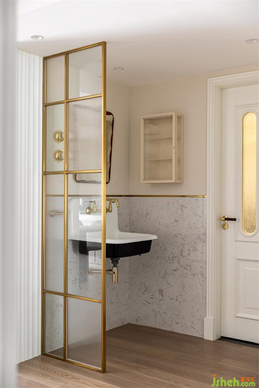 干區(qū)我們舍棄了常規(guī)的衛(wèi)浴柜形式,花漾美作選用了經(jīng)典復(fù)古的干掛臺盆,櫻桃木框的鏡面與長虹玻置物柜,加上銅質(zhì)通透的藝術(shù)玻璃隔斷,讓原本純功能性的區(qū)域變得調(diào)性十足,壁掛的五金和壁燈讓家里這個(gè)小小的角落也充滿氛圍感。