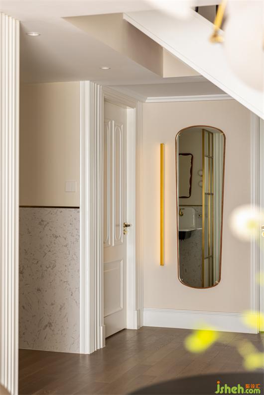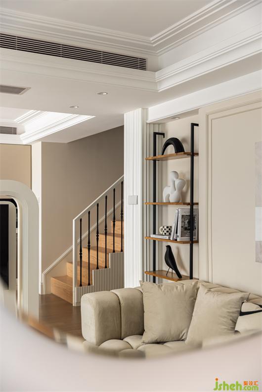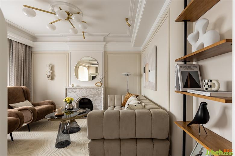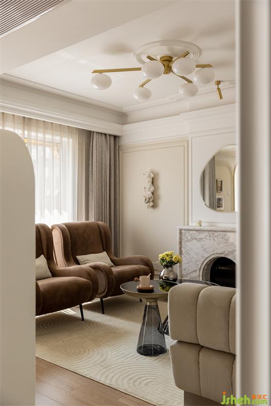 客餐廳之間設(shè)置一個(gè)360°旋轉(zhuǎn)電視架,花漾美作運(yùn)用了中軸對(duì)稱的設(shè)計(jì)理念,與大理石裝飾壁爐相呼應(yīng)布置,客廳圍合成經(jīng)典的對(duì)坐形式,高低組合鏡面質(zhì)感的茶幾現(xiàn)代時(shí)尚,木層板和鐵藝鋼架組合的展示架讓整個(gè)精致的空間增添了些許休閑氛圍。