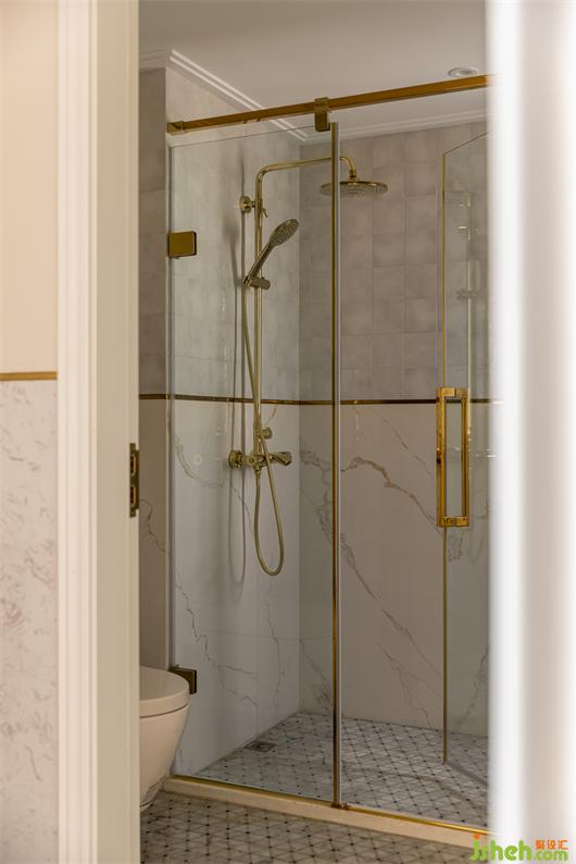 客衛(wèi)為了更好的打理,選用了壁掛座便器,地面與廚房選用同款馬賽克地磚,墻面則采取上下分割的方式,上圈斑駁質(zhì)感的釉面小磚鋪貼,下墻裙則選用大磚通鋪,花漾美作保證整潔的同時(shí)也有利于后期打理。復(fù)古的金色亮面花灑與淋浴隔斷材質(zhì)相呼應(yīng),金色腰線的點(diǎn)綴,靈動(dòng)的勾勒出空間的精致感。