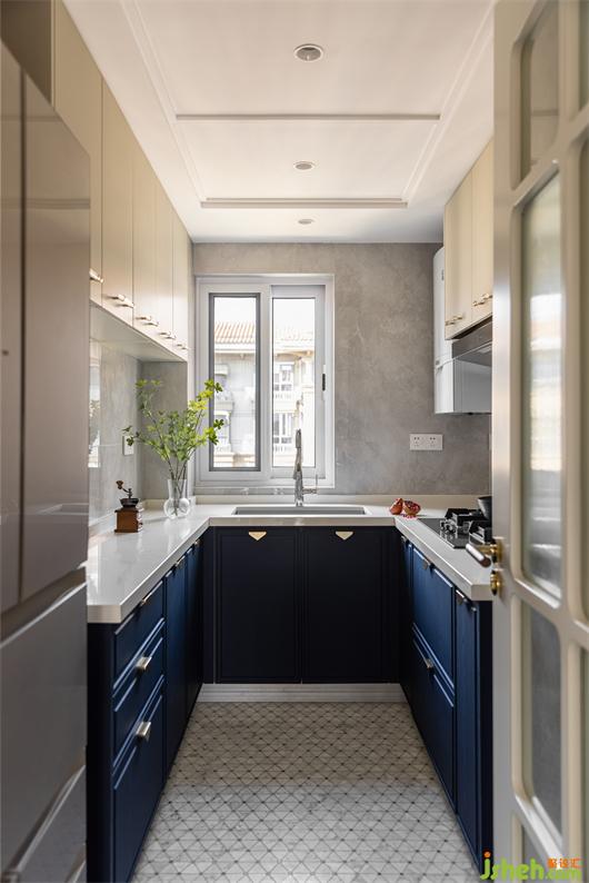 廚房利用次臥空間內(nèi)凹出雙門冰箱的位置,花漾美作利用有限的空間設(shè)計(jì)了小U型操作臺(tái),左手邊淺臺(tái)做備餐用,盡可能增加收納空間和操作臺(tái)面,奶白+藏藍(lán)的復(fù)古凹凸門板搭配讓整個(gè)空間增添些許英倫格調(diào),三角形、亞克力金色把手,三角形大理石馬賽克地磚,處處都是輕復(fù)古的小細(xì)節(jié),精致有范。