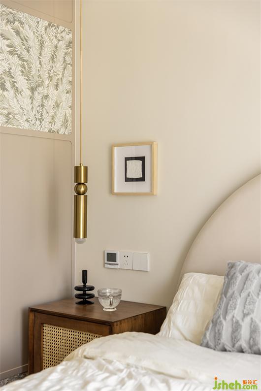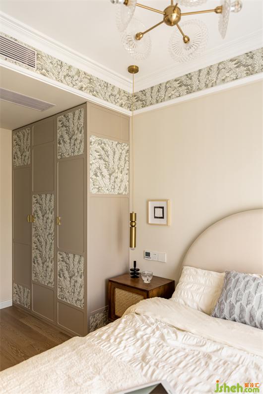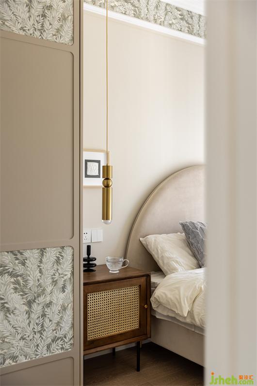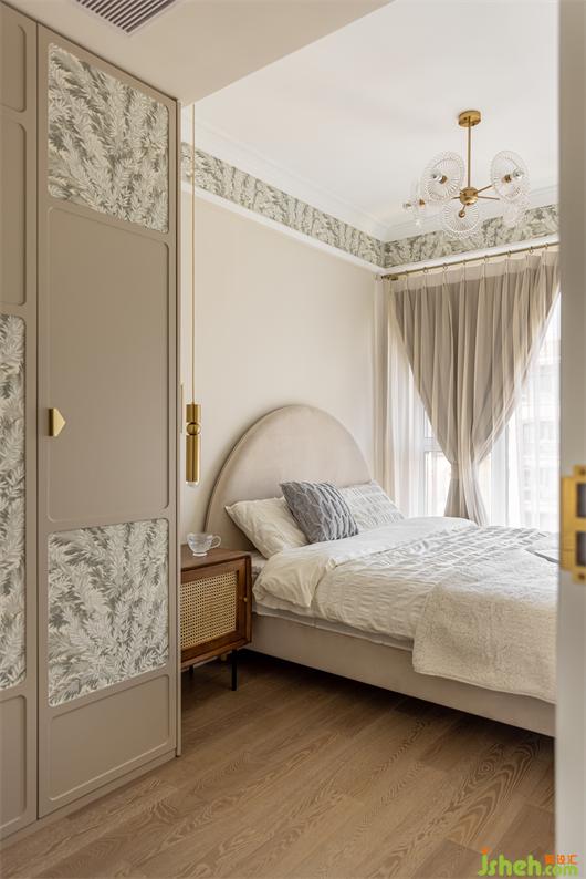 客臥是咖色色系的整體搭配,開(kāi)門既是衣柜柜門,門板上的圓弧修邊,不規(guī)則的方塊排布,花紋壁紙點(diǎn)綴其中,花漾美作讓原本不起眼的柜門瞬間變成了玄關(guān)裝飾,淺灰色絨布的圓弧床背與床頭編織質(zhì)感的床頭柜搭配,輕復(fù)古的韻味由然而生,吊頂側(cè)邊的花紋壁紙與柜門點(diǎn)綴相映成趣,夢(mèng)幻窗簾的修飾讓整個(gè)空間彌漫浪漫氣息。