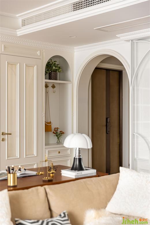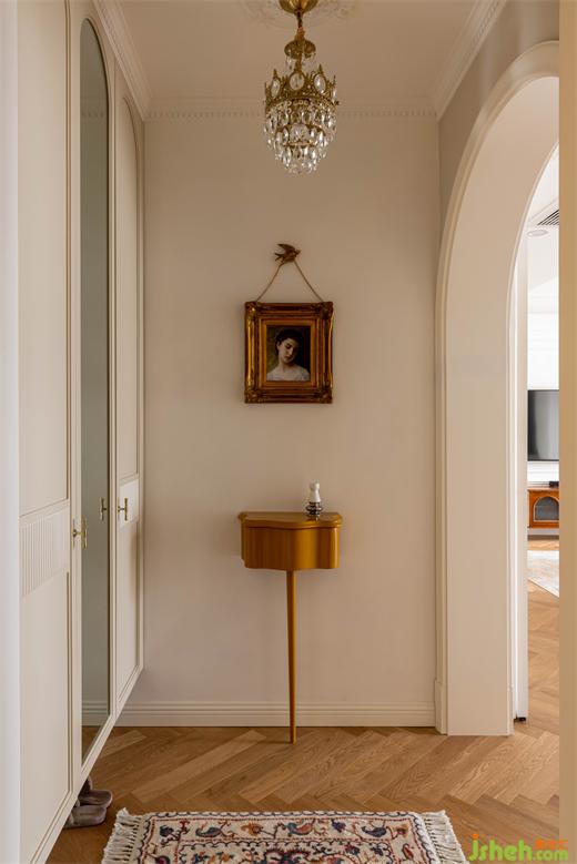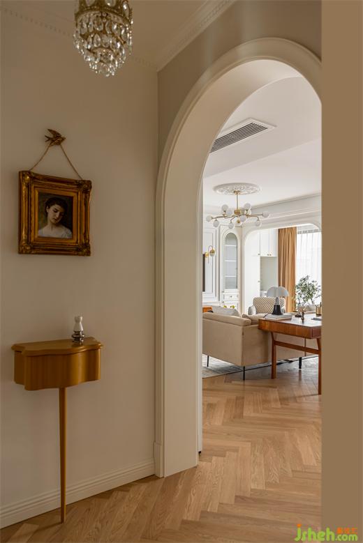 入戶正對的是法國畫家布格羅的女孩肖像油畫,做舊畫框與下方姜黃色的Zanotta單腿柜相呼應(yīng),南京裝修設(shè)計公司緊抓視線焦點,給人奇妙的感官體驗。法式拱門的優(yōu)雅弧線將一絲靈動帶入這個方正空間,也為步入客餐廳空間增加了儀式感。