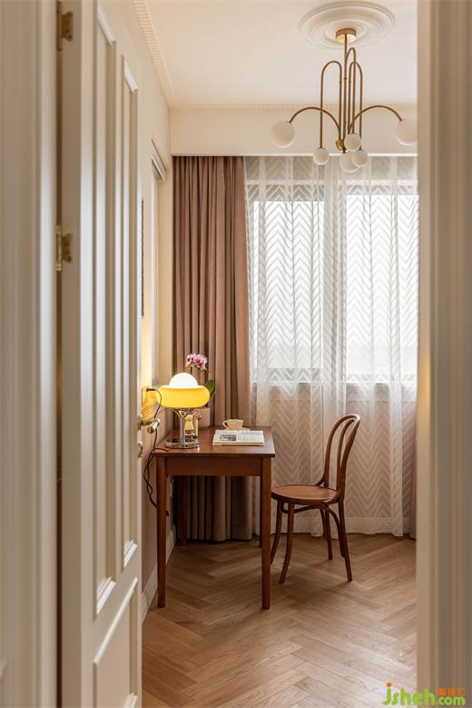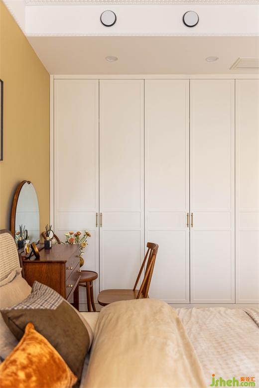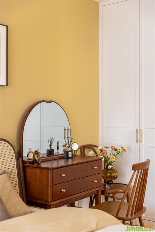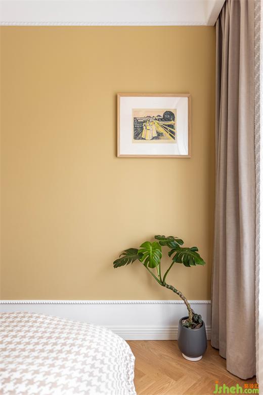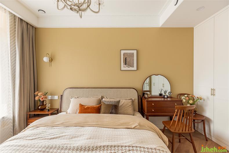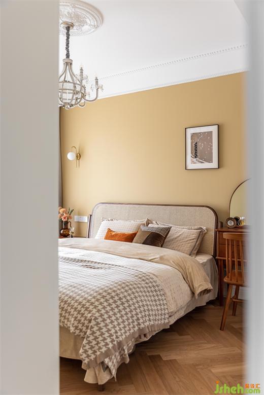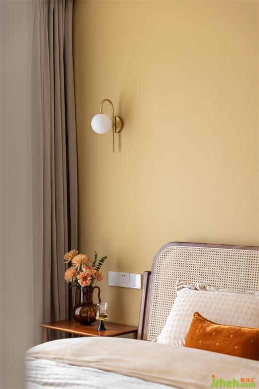 溫和的暗檸檬黃作為墻面基調(diào),并進(jìn)行分色處理,讓空間更具層次感。藤編床頭、胡桃木梳妝臺、造型吊燈、奶咖窗簾,南京裝修設(shè)計公司多重材質(zhì)在空間中奇妙碰撞,營造出精致摩登又不失經(jīng)典浪漫的奇妙氛圍,細(xì)微末節(jié)處充滿精致。