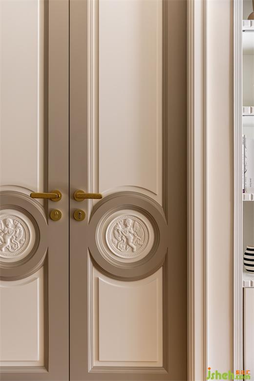 鞋柜融合卡座設計,內(nèi)部有掛衣區(qū)和鞋帽區(qū),外部設計開架及抽屜,花漾美作方便業(yè)主多方位儲物需求,疊級門板搭配金屬把手及藤編元素提升了空間的活力。
