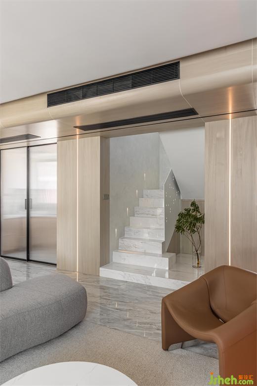 墻面木色延伸至頂,增加空間縱深感,南京家裝設(shè)計(jì)墻面內(nèi)嵌線性燈,功能性與裝飾性相結(jié)合。