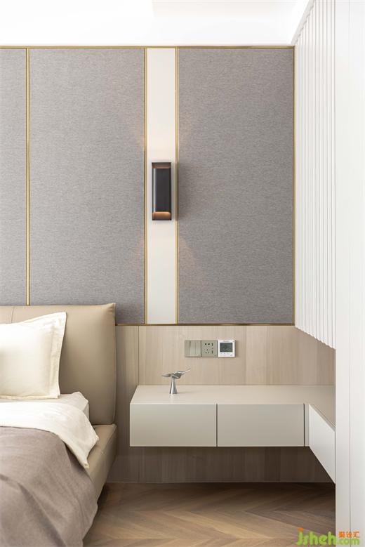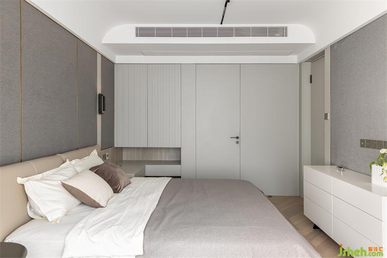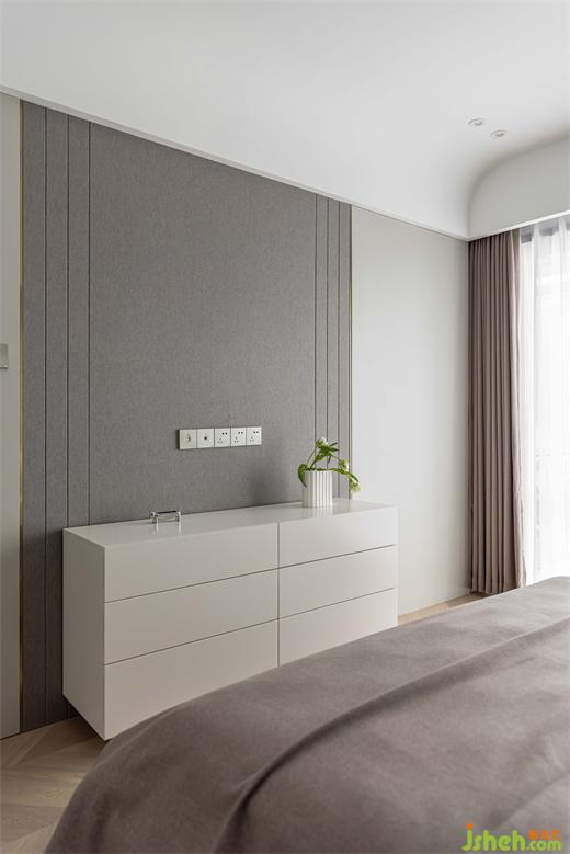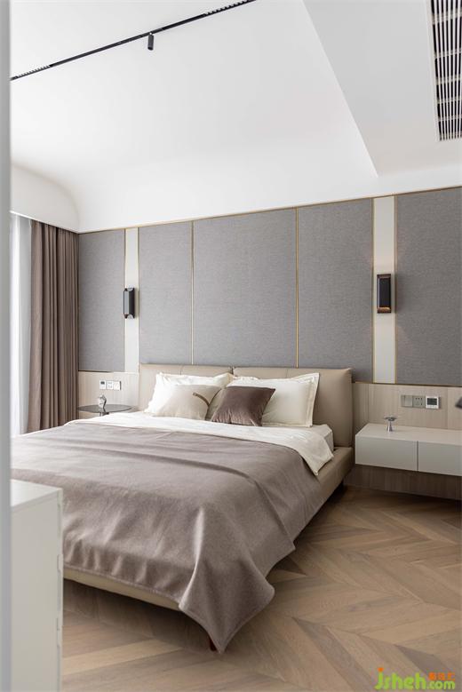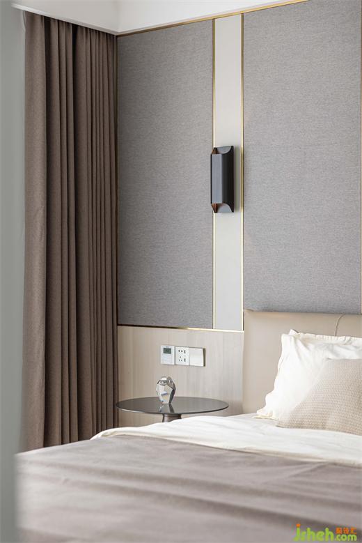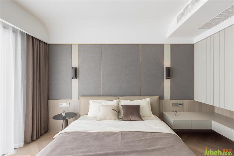 南京家裝設(shè)計(jì)以灰咖色為主色調(diào)的主臥,相較公共空間少了些熱情,但更為溫和包容,為放松和睡眠提供更加舒適的氛圍環(huán)境。