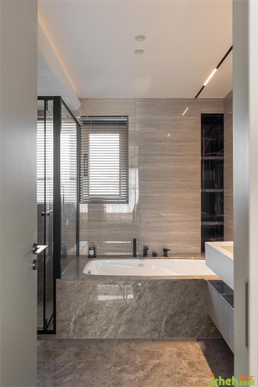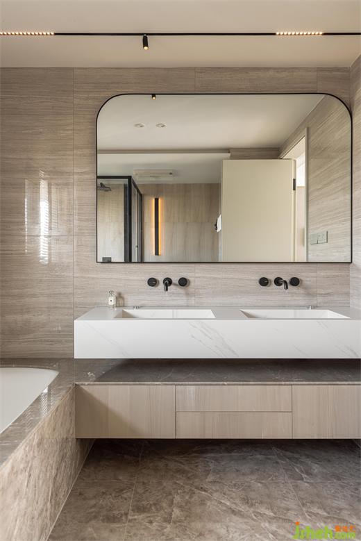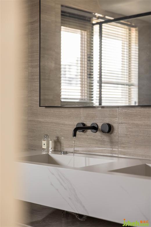 雙臺盆設計,洗漱空間寬敞,同時使用時候也不會受到影響,嵌入式龍頭和一體式的石材臺盆,減少衛(wèi)生死角。