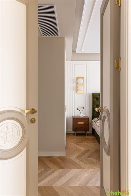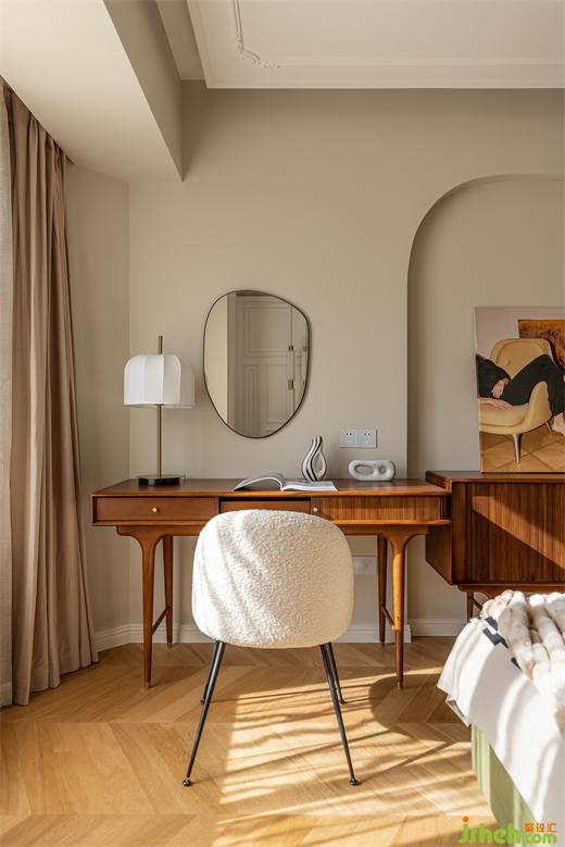 主臥延續(xù)客餐廳柔美的淺色系,綠色絨布床與棋盤格床品搭配復(fù)古典雅,裝修設(shè)計深紅色柚木梳妝臺與邊柜紋理通直,色澤光亮,黃銅色燈具與柜門金屬把手點綴精致感,臥室呈現(xiàn)出一種浪漫優(yōu)雅且溫柔動人的氣場。