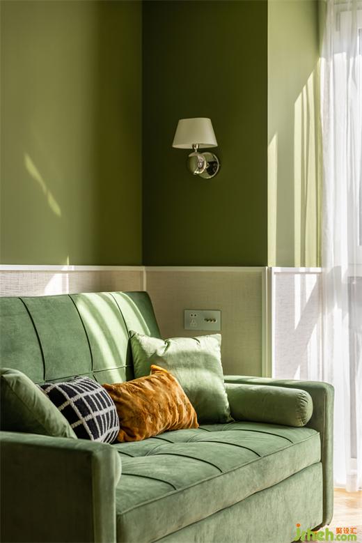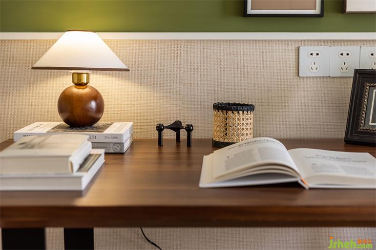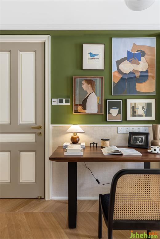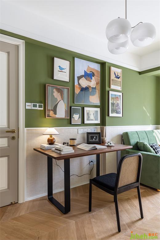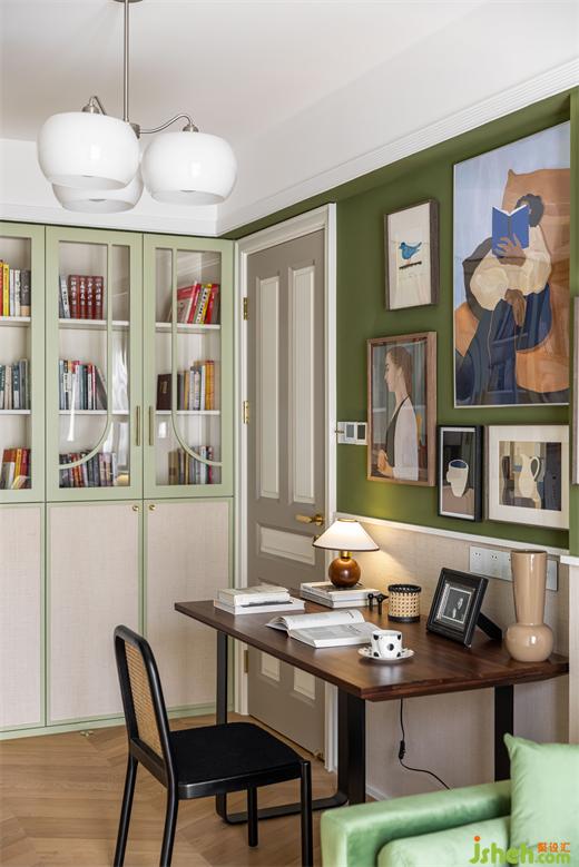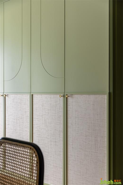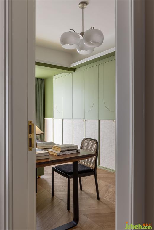 綠色系書房空間不大,卻是家里功能最多的所在,兼具次臥、儲物間,同時(shí)容納鋼琴區(qū)。裝飾畫結(jié)合了閱讀元素與書房氛圍完美契合,裝修設(shè)計(jì)絨布沙發(fā)床與絨布窗簾交相輝映。鋼琴區(qū)開架呼應(yīng)了客廳的木色元素,柜門上的藤編壁紙為空間帶入幾縷休閑氣息。