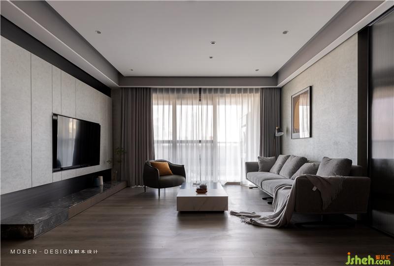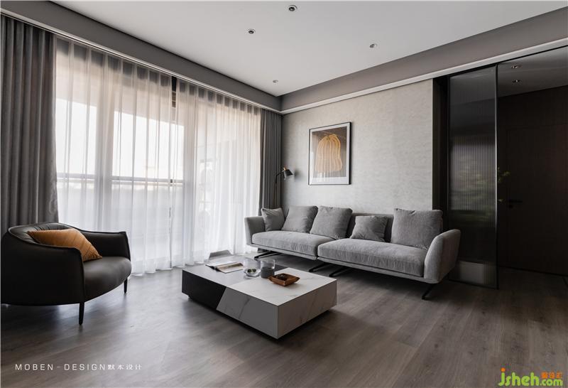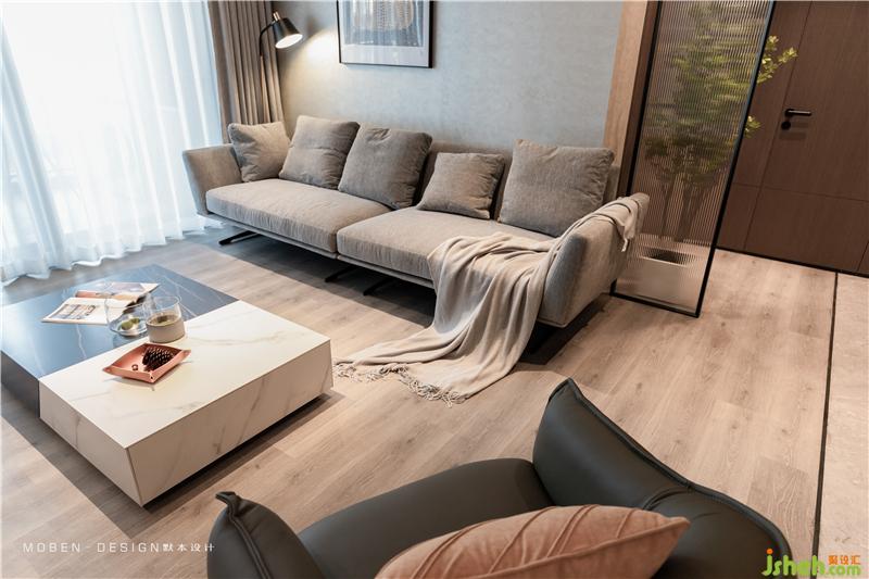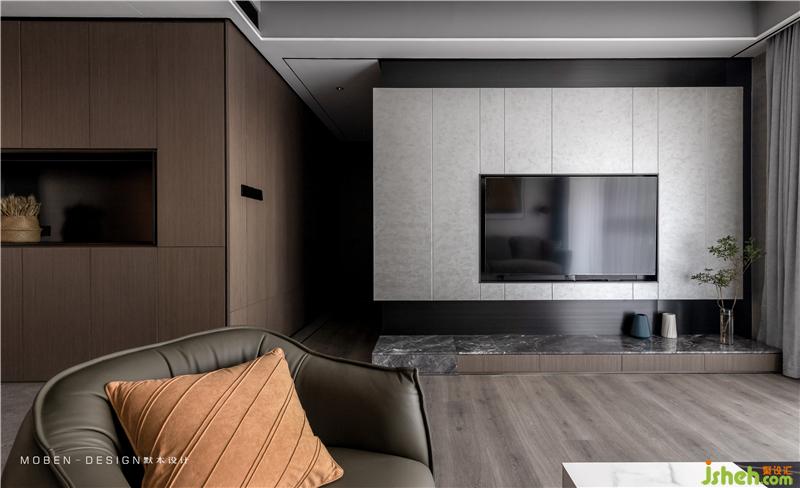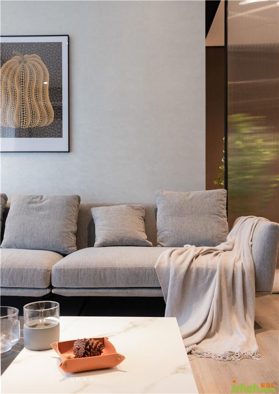 灰色L型主體背景,側(cè)面延伸進(jìn)過道,從視覺上拉長整體比例感