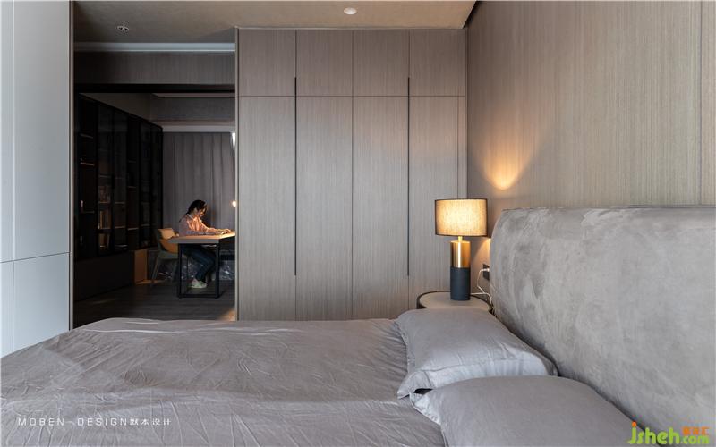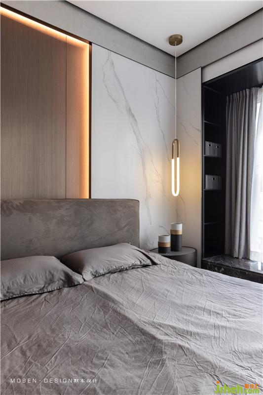 床頭背景使用轉(zhuǎn)折延伸的設(shè)計手法,低調(diào)有氣質(zhì)