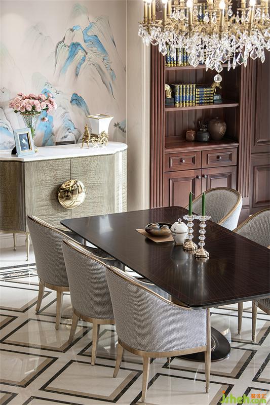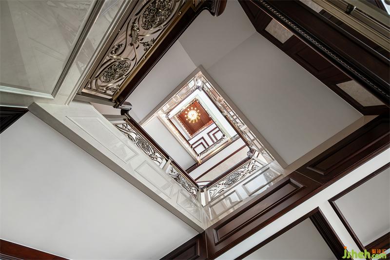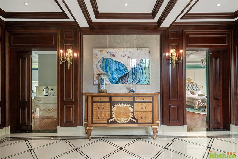 拾階而上,精美繁復(fù)的儲(chǔ)物柜與大理石拼花相映,來(lái)到開闊的二層居住空間。