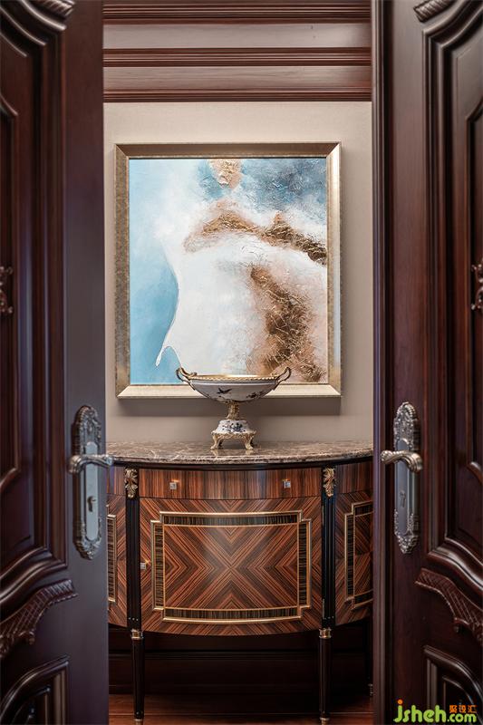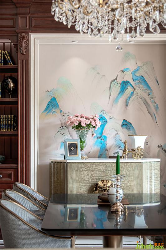 懸掛在廊道與臥室之間的畫作來(lái)自POSILLIPO瑪瑙明珠,靈感源于地中海的寶石、瑪瑙、香水的顏色,海洋的深淺陰影和海風(fēng)中飛翔的蝴蝶。將精致的奢雅主義與中式的返璞歸真感平衡得恰到好處,一切從這里慢了下來(lái)。
