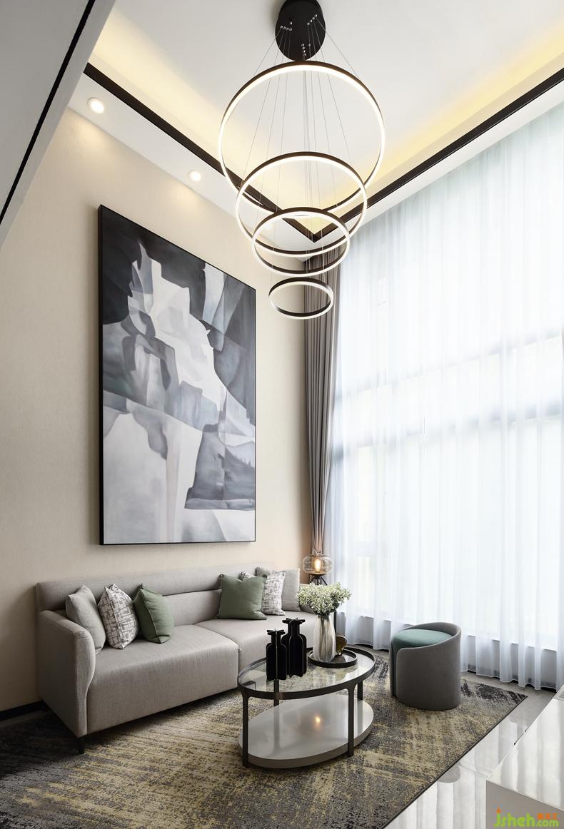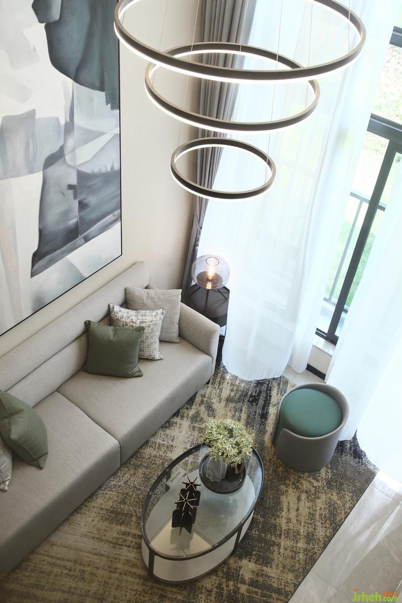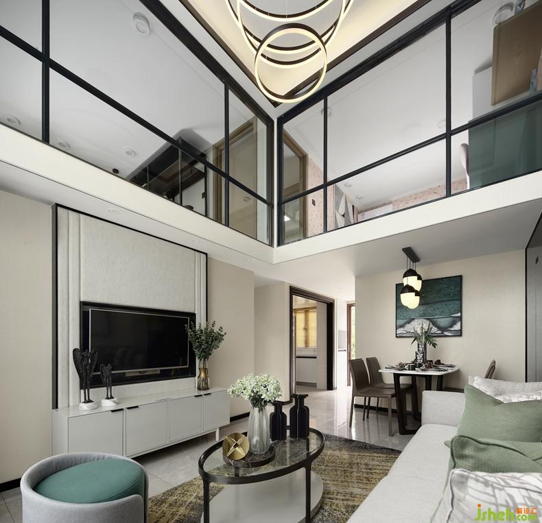 時代豪庭B戶型雙層公寓樣板間采用半圍合式布局,充當對外空間的客廳作為設計的中心貫穿整體空間。具有金屬質(zhì)感的吊燈自二層頂端懸垂而下,金屬框架和玻璃組成的空間隔斷,以及客廳與餐廳之間的開放式連接,設計公司打破了傳統(tǒng)LOFT格局的狹窄和蔽攏,讓有限空間得到盡可能的放大和延伸。