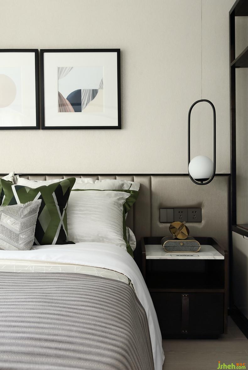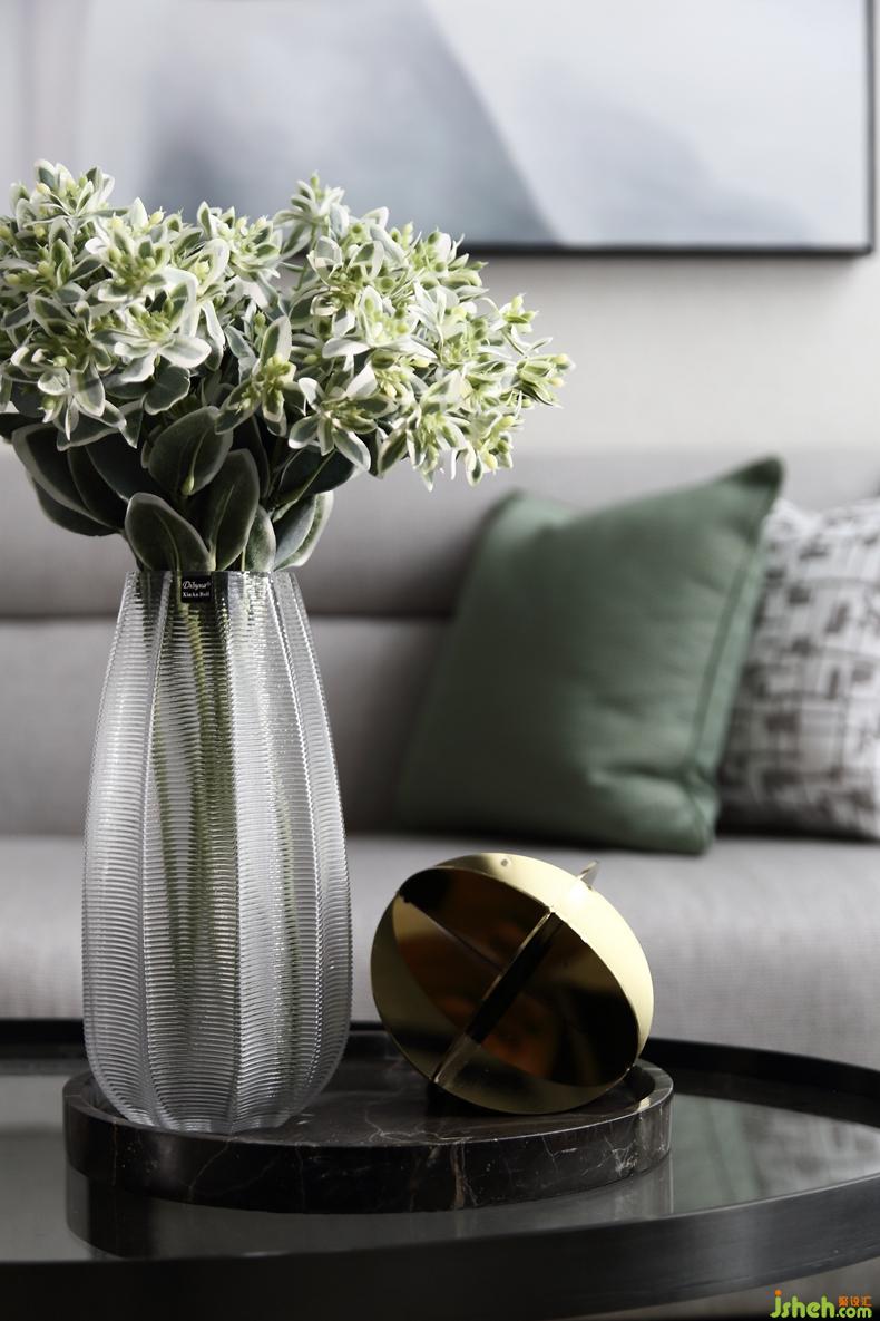 墻面、沙發(fā)、窗簾及床飾使用了統(tǒng)一的米灰色調(diào),而綠色調(diào)的巧妙使用,如斑駁的深綠地毯、置于桌臺茶幾的植物盆摘和餐具,以及懸掛于臥室的裝飾畫等,又讓整體氛圍多了清新自然的氣息,讓人感到心情明快。