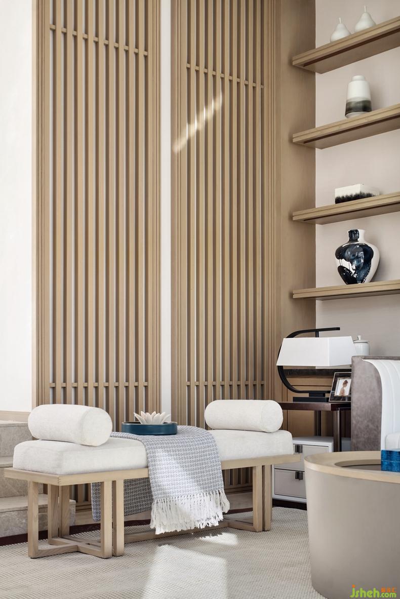主臥設(shè)計,以桃花為主題創(chuàng)作空間,清雅十足。原木格柵在這里得以延用。別墅裝修設(shè)計現(xiàn)代精致的藝術(shù)陳設(shè),貼近自然的生活氣息,是設(shè)計師關(guān)于理想化生活空間的思考與探求。