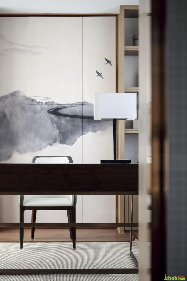 書房的設(shè)計(jì),流線型的墨線揮灑,融入遠(yuǎn)處的青山和白水,燕鳥在這方天地轉(zhuǎn)圜翱翔。別墅裝修設(shè)計(jì)墻上的飾畫對整個(gè)空間主題進(jìn)行詮釋:不若歸于此。畫里畫外,室內(nèi)室外,舍棄浮華與喧囂,重歸天地與自然。
