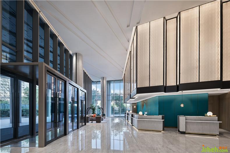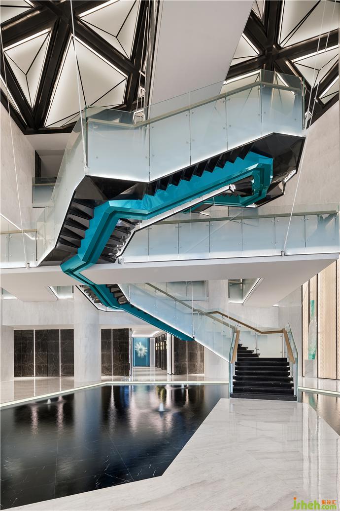 接待大廳像是一個輕輕漂浮空中的巨大藝術(shù)盒子。鉆石切面延續(xù)了入口的菱形,截取紋理的精致墻面層層鋪疊,可以變換顏色的光影,讓空間粼粼流淌起來。抽象演繹的齒輪元素被設(shè)計師融入藍(lán)綠色背景墻的鐘盤造型設(shè)計中,寓意以時間銘刻城市歷史。酒店裝修設(shè)計