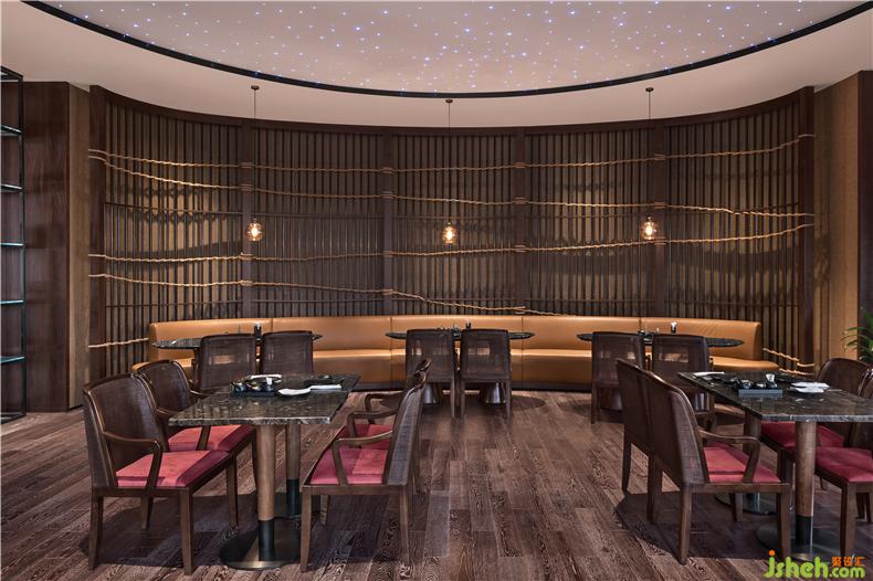 酒店裝修設(shè)計包間色調(diào)趨于沉穩(wěn),木質(zhì)格柵的墻面上裝飾有粗糙質(zhì)感的麻繩,酒店設(shè)計師將自然的美感注入其中,天花弧形玻璃燈具設(shè)計,如同呈現(xiàn)出一片令人向往的浩瀚星宇。