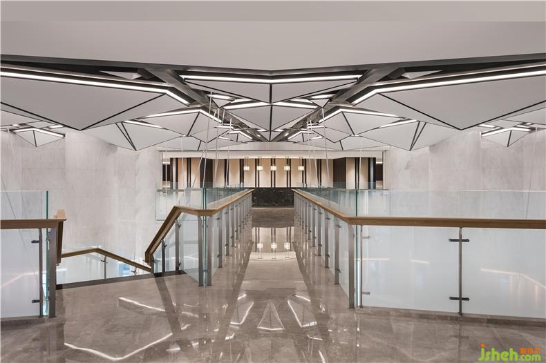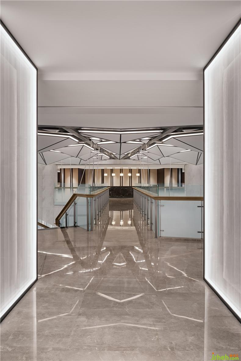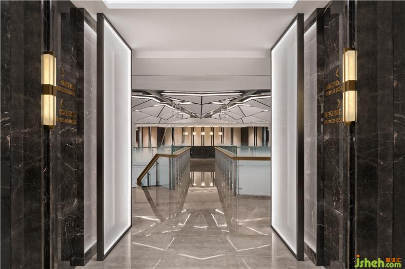 行至二層,空間中天花的設(shè)計由杭州綿延起伏的山體倒置演繹而來,酒店設(shè)計整個空間以黑白描繪,形態(tài)肌理的變化呈現(xiàn)出豐富多元的空間感知。