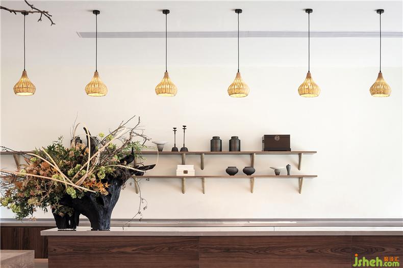 入口處,取自田間的南瓜瓜藤被巧妙用作空間中的藝術(shù)裝置,演繹田園之樂。整個(gè)空間輔以大量的竹木,意蘊(yùn)古樸,光影變化中,增添了清新和雅氣息。