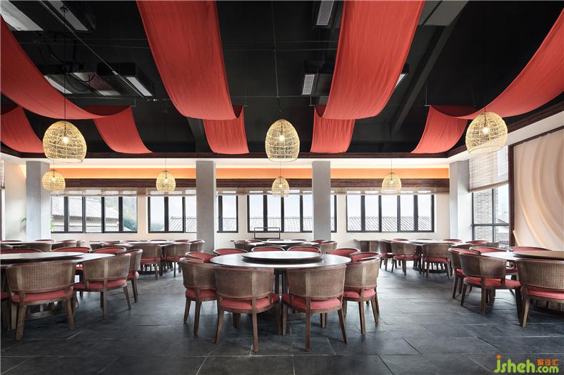 一樓素食餐廳色調(diào)暖黃,曰晨,曰向陽,寓意初生的太陽,一日之晨,酒店設(shè)計(jì)生機(jī)無限;二樓的葷食餐廳則色彩濃烈,紅色彩帶如行云流水般點(diǎn)綴其間,起心念,動(dòng)食指,噴薄而熱烈,充滿能量。設(shè)計(jì)師希望人們?cè)谟貌蜁r(shí)懂得珍惜和感恩。