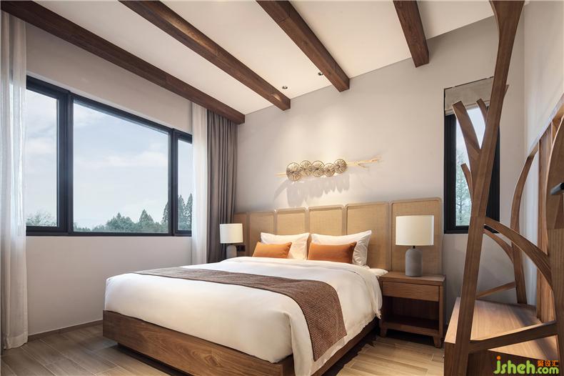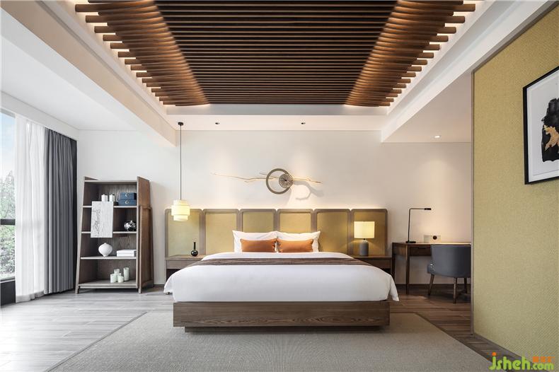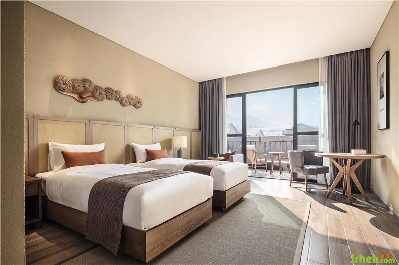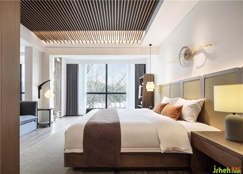 移步換景,得觀居室。室外晴日照,光影空靈,輔以竹藝、杏花等形色作點(diǎn)綴,酒店設(shè)計(jì)于方寸之間,交織出一室簡(jiǎn)約雅致。