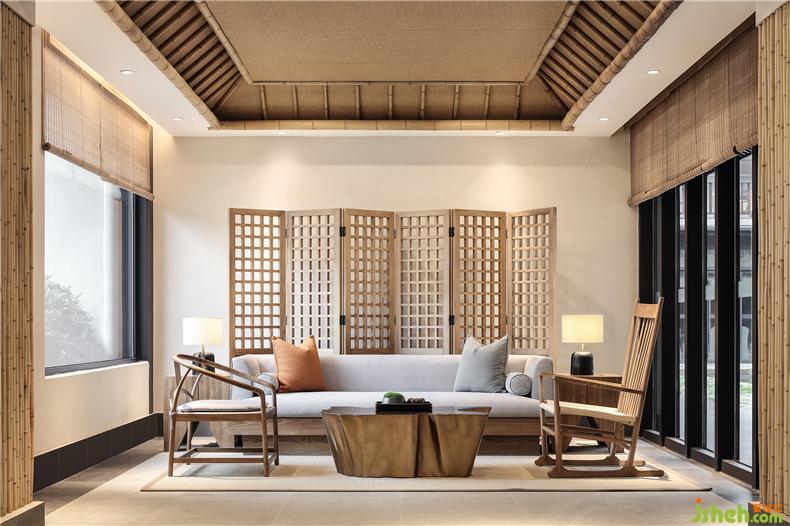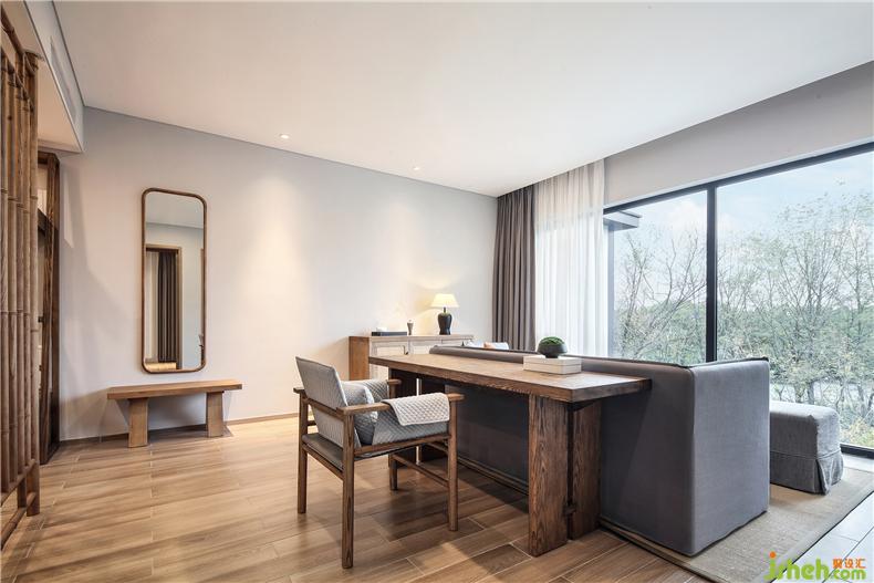 杏花柔媚,花色潔白,大堂延續(xù)著素雅之美;樹榴茶桌長(zhǎng)短廣狹不齊,置之于室,古雅溫潤(rùn);從疏線到編織,劍麻地毯的鋪陳,簡(jiǎn)樸之中清新蔓延。