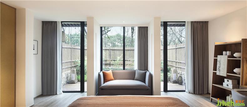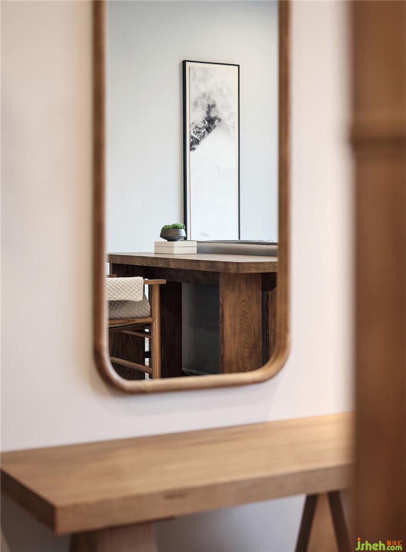 床頭藝術(shù)掛件取自“一枝獨(dú)秀”的花枝形態(tài),以此呼應(yīng)杏花居的主題。花木有時(shí),幽居以花為伴,一室清雅,更自可愛。