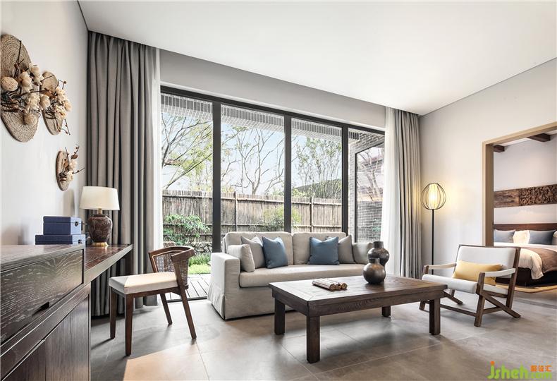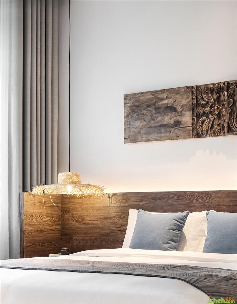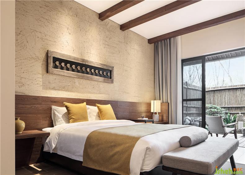 客房布草裝飾選用棉麻材質(zhì),色彩過(guò)渡柔和,給人暖意。酒店設(shè)計(jì)床頭的實(shí)木雕畫回歸原野古樸,竹編吊燈造型各異,一花一草一木皆入景,簡(jiǎn)而裁,巧而自然。竹藏風(fēng)雨,觸及野趣,山居生活隱逸悠然,靜念生長(zhǎng)。