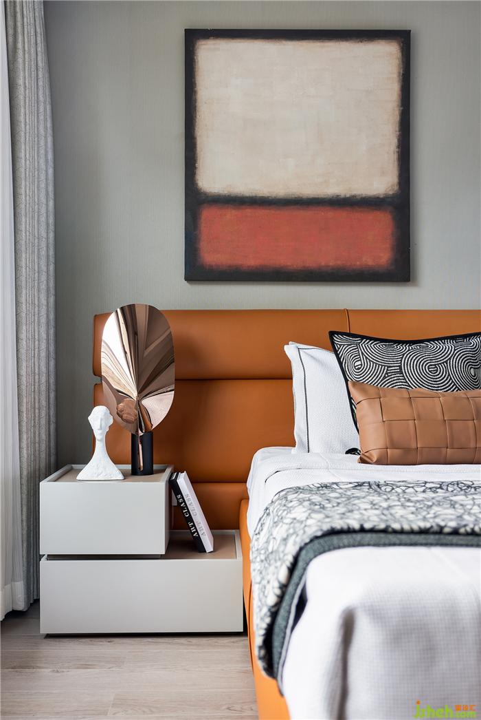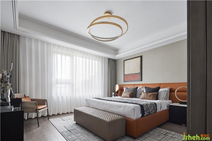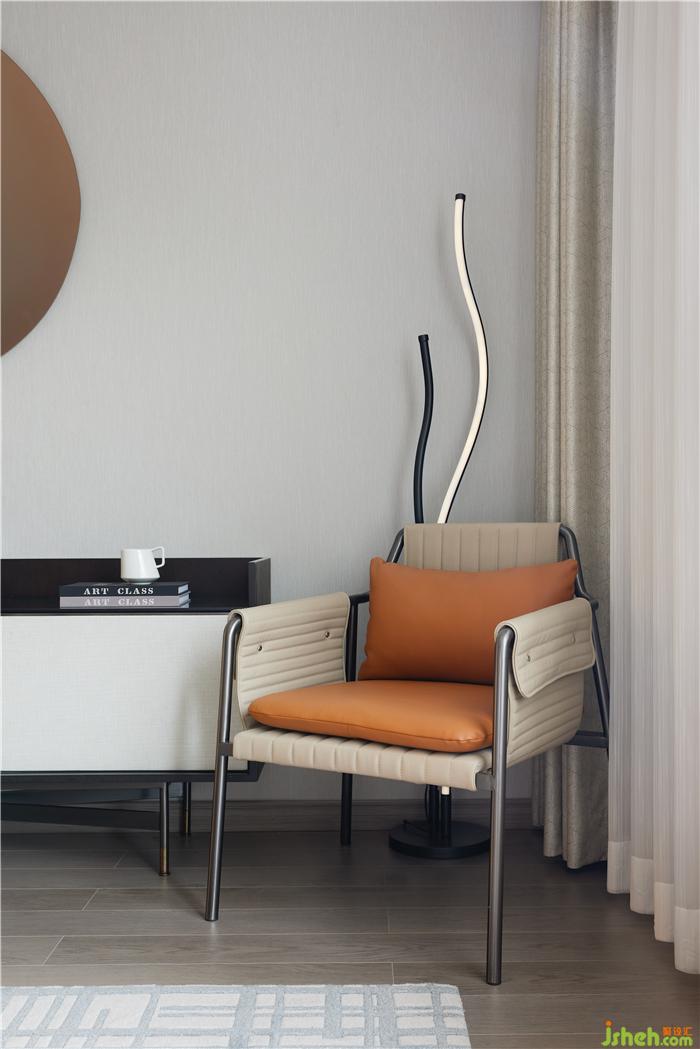 臥室延續(xù)了輕奢典雅的基調(diào),明亮搭配有序,霧灰與暖橘,皮質(zhì)與金屬,樣板房設(shè)計空間整體色調(diào)徜徉著詩意的光感。陽光傾灑,光影和諧,方圓之間是望得見的煙火氣息。