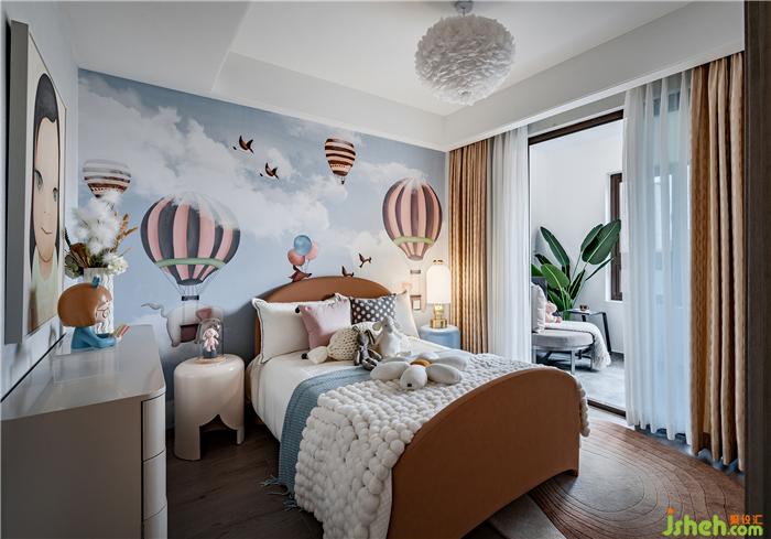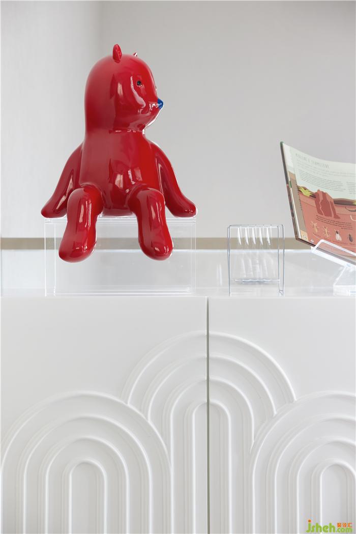 男孩房的空間靈感來自于林占占藝術(shù)家筆觸下的童話世界——荒野、怪獸、夜空,樣板房設(shè)計還有那只從自然中走來的紅色pupu熊,它在奔跑,它在等待,卻從未忘記尋找治愈的力量。