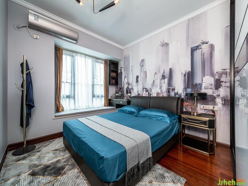 不要以為所有的原家具都是美式,現(xiàn)代感十足的床,那就搭配一下更摩登的背景墻紙吧,讓整個(gè)空間都有了色彩。