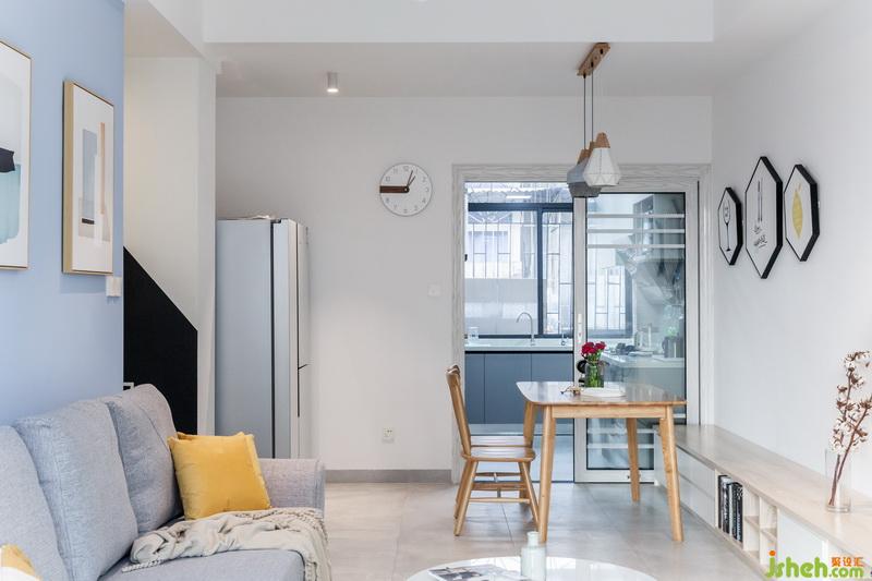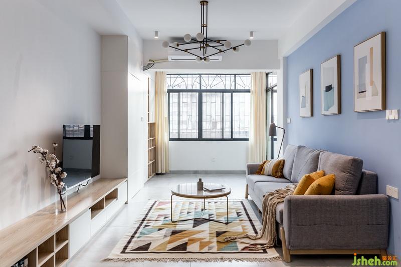 沙發(fā)背后那一抹藍色,跳躍起整個空間,靈動而有魅力。電視背景和房門在同一平面,房門采用隱型門設(shè)計,使有型藏于無形之中。