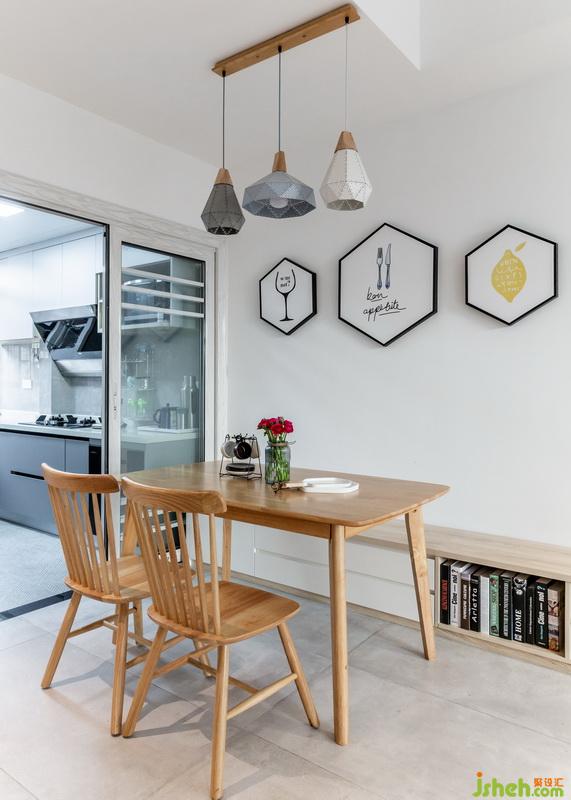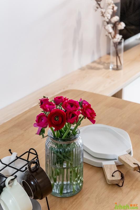 白色與木色搭配形成的儲物卡座,實用與美觀形成一體,原木色餐桌無形跟卡座相映成趣。閑暇時,沖一杯咖啡,擺放一束花兒…