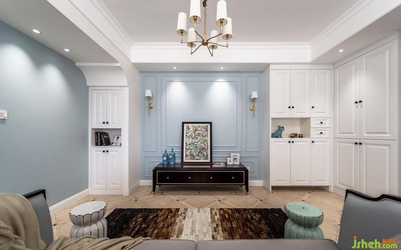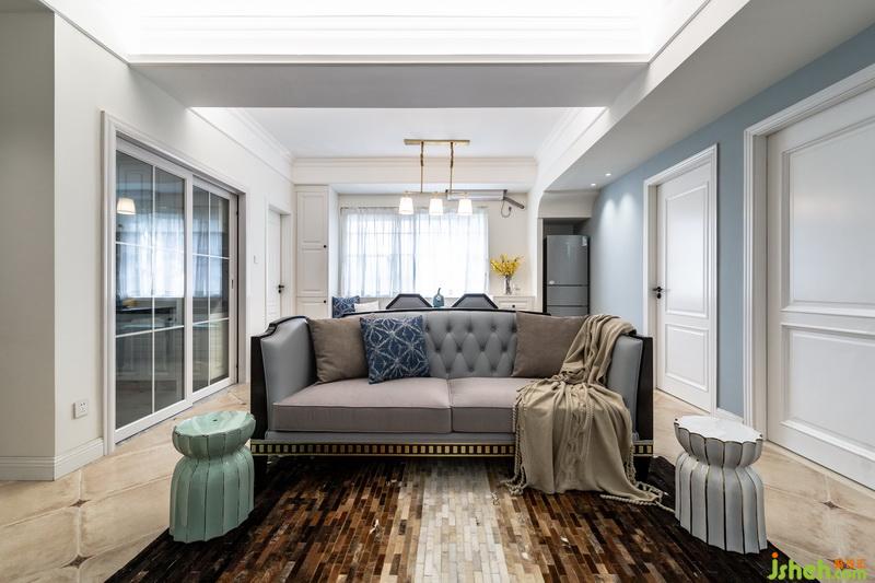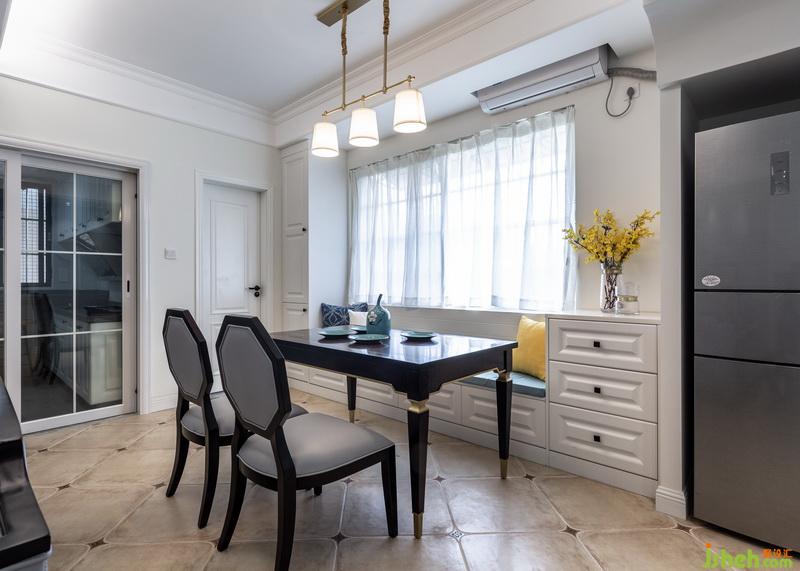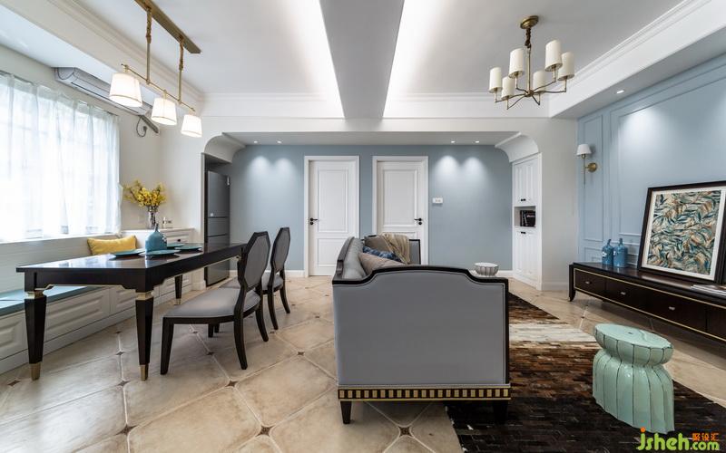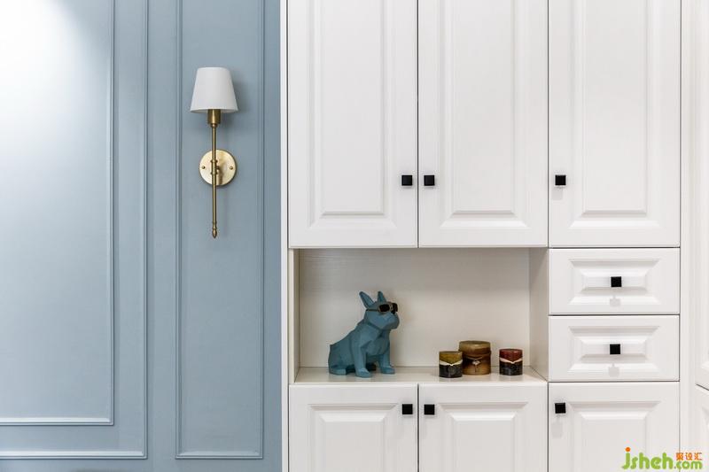 客廳和餐廳之間用沙發(fā)解決,家里不用電視,所以電視墻預(yù)留出沙發(fā)可擺放空間,讓空間擁有更多可能性,餐廳靠近窗戶位置設(shè)計(jì)一整排卡座,高低錯(cuò)層的處理,滿足小空間餐邊柜的需求,靠衛(wèi)生間墻面的高柜,也可以收納一些備用洗漱用品。深胡桃木色餐桌擺上餐具便是人間煙火氣,擺上花藝、書(shū)本及家中小蘿莉的繪板亦是滿室書(shū)香及溫情。沿梁設(shè)計(jì)的造型門(mén)廊刷上整面墻灰藍(lán)色墻漆作為背景底色,暖白色燈光灑在墻面,墻面暫缺的飾品,就讓時(shí)間慢慢填滿,設(shè)計(jì)的同時(shí)留一些空間讓業(yè)主和房子共同制造回憶。